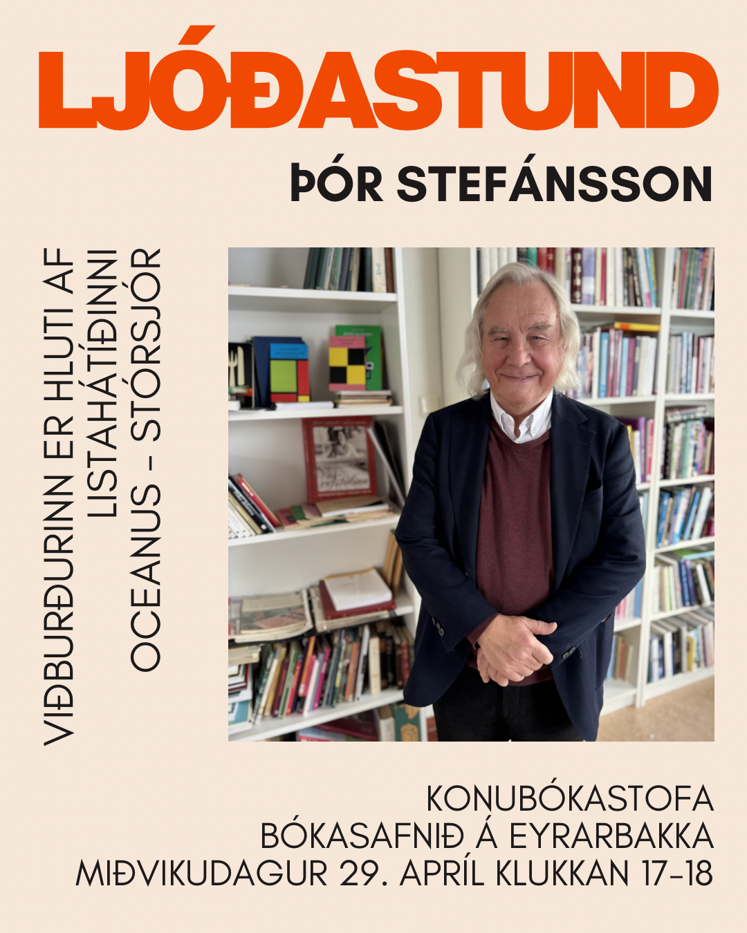 Everyone is warmly welcome to an Hour of Poetry with Þór Stefánsson. A friendly collaboration between the Library in Eyrarbakki and Oceanus “Stórsjór”. Þór Stefánsson is one of the Oceanus artists this year.